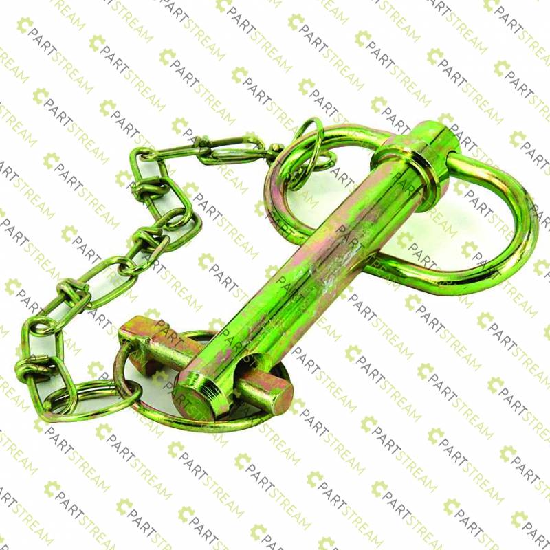 Auger Pin. Secures Auger unit to the Drive Head. Also common draw bar hitch pin. Zinc Plated Gold Finish