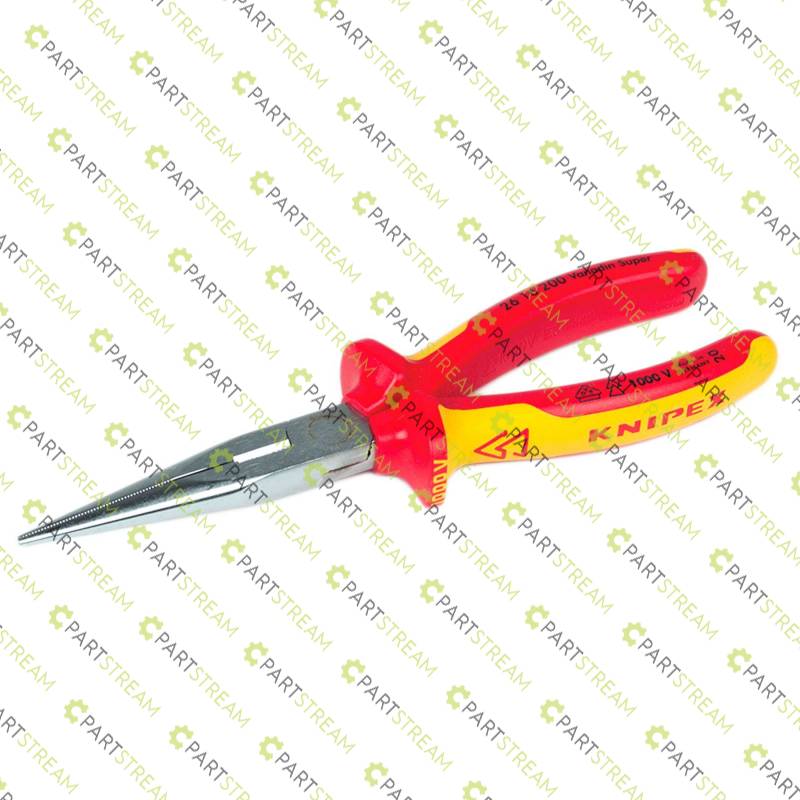 Knipex Longnose Pliers. Needle nose pliers (stork beak pliers) for assembly, alignment, and gripping work, especially in the electrical trade. Very long pointed, flat rounded jaws. Cutting edges with bite type cut for soft, medium-hard, and hard wire; cutting capacity for 3.2mm medium-hard wire, cutting capacity for 2.2mm hard wire. Forged from vanadium electric steel and oil-hardened; cutting edges additionally induction hardened to approx. 61 HRC for exceptionally high cutting force. Pliers are chrome plated. Insulated with multi-component grips. VDE tested. Weight 204g. Made in Germany.